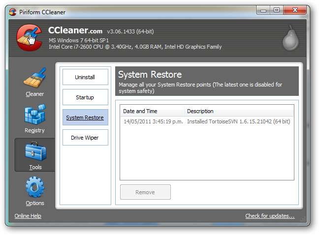 Ripristino configurazione di sistema in CCleaner offre più opzioni per rimuovere i punti di ripristino del sistema rispetto a Pulizia disco. Disattiva il tuo ultimo punto di ripristino del sistema, in modo che tu non possa rimuoverlo, per motivi di sicurezza.