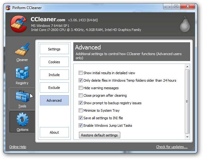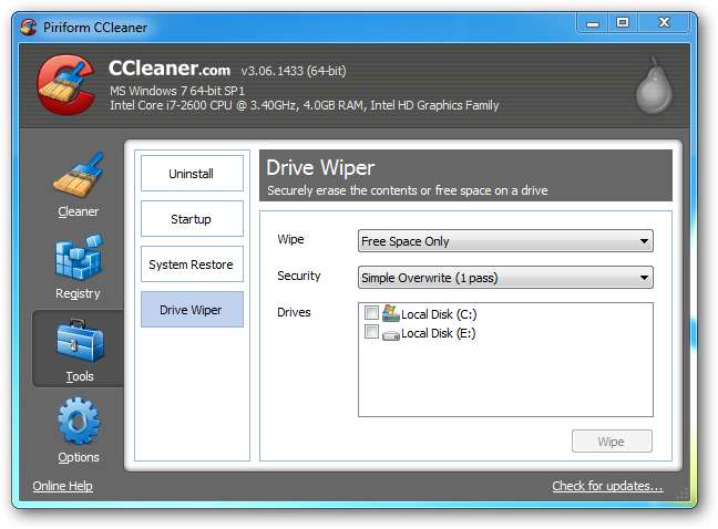 Windows non eliminerà i dati effettivi che hai eliminato, rimuoverà semplicemente il riferimento a quel file e lo sovrascriverà quando salverai nuovi dati. Questo rappresenta un rischio; qualche furbo intelligente potrebbe intrufolarsi nel tuo computer e ricostruire i tuoi dati prima che Windows li sovrascriva. Se sei preoccupato, puoi istruire CCleaner a pulire questo tipo di dati utilizzando "Drive Wiper".