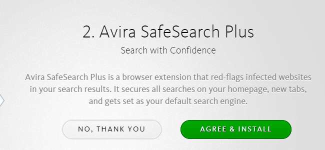 Avira ti incoraggia a installare "Avira SafeSearch Plus". Questa è solo una versione rinominata della barra degli strumenti Ask, che reindirizza i risultati della ricerca attraverso una versione rinominata del motore di ricerca Ask.com. se non desideri che la barra degli strumenti Ask sia installata, non vorresti nemmeno che fosse installata questa versione rinominata.