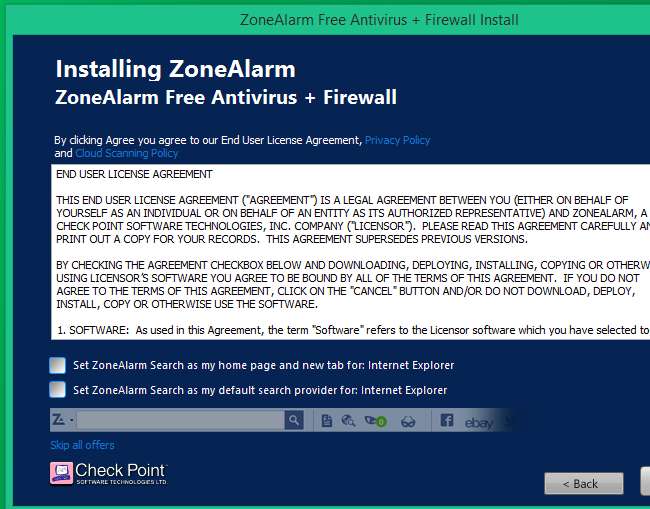 ZoneAlarm vuole anche che tu attivi "ZoneAlarm Search" come home page e motore di ricerca predefiniti del tuo browser, insieme all'installazione di una barra degli strumenti ZoneAlarm che è, ancora una volta, una versione rinominata della barra degli strumenti Ask.