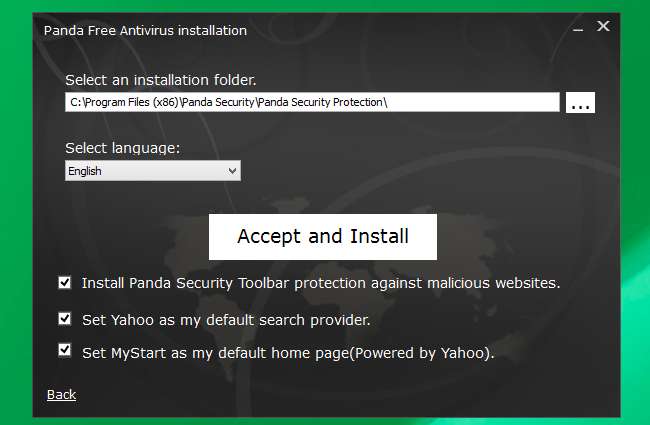 Panda tenta di installare la propria barra degli strumenti di sicurezza del browser e di cambiare il motore di ricerca del browser in Yahoo e la sua home page in "MyStart", che è alimentato da Yahoo. A merito di Panda, almeno non tentano di ingannarti offrendoti un motore di ricerca Yahoo rinominato o una home page.