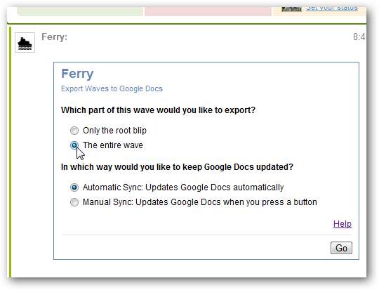 Questo aggiungerà un nuovo file Traghetto blip alla tua onda. Seleziona se desideri esportare l'intera wave o solo il blip radice, quindi fai clic su Partire in fondo. Nota che Ferry sincronizzerà automaticamente anche tutti i nuovi dati in questo Wave to Docs, sebbene tu possa selezionare Manuale per disattivarlo se lo desideri.