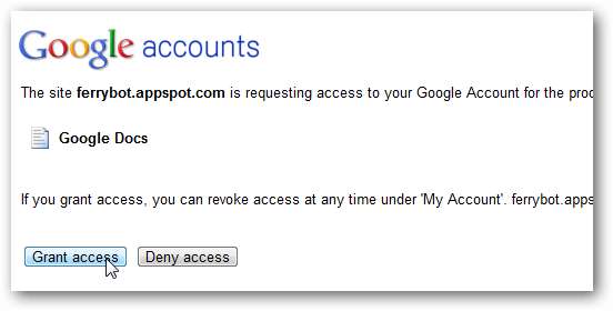 Google Documenti si aprirà ora in una nuova scheda e ti chiederà se vuoi consentire Traghetto per avere accesso al tuo account. Clic Concedere l'accesso continuare.
