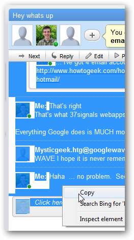 Un altro modo per estrarre i tuoi dati da Google Wave è copiarli direttamente e incollarli in un'altra applicazione. Fare clic nella parte superiore dell'onda e trascinare verso il basso per selezionare tutto il contenuto.