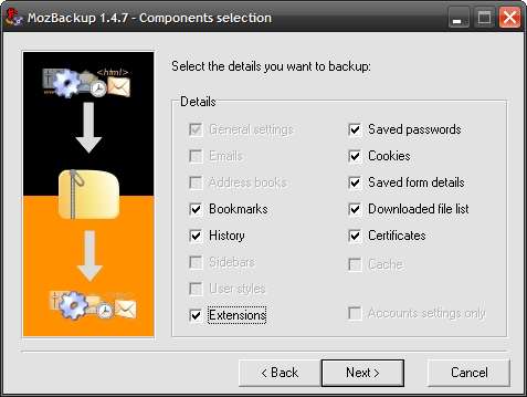 Nella finestra di dialogo successiva selezioneremo quali dettagli nel profilo Firefox salvare o meno. Tieni presente che se scegli di salvare le estensioni non è garantito che vengano ripristinate correttamente, ma non ho ancora avuto problemi con esse. Al termine della configurazione dei dettagli, fare clic su Avanti.