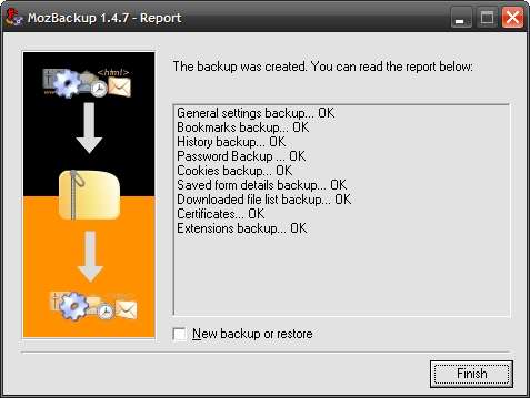 Backup riuscito! Fai clic su Fine e porta le tue impostazioni di backup al PC successivo. Oppure, se desideri creare un nuovo backup delle applicazioni Mozilla, seleziona Nuovo backup o ripristino e segui i passaggi precedenti.