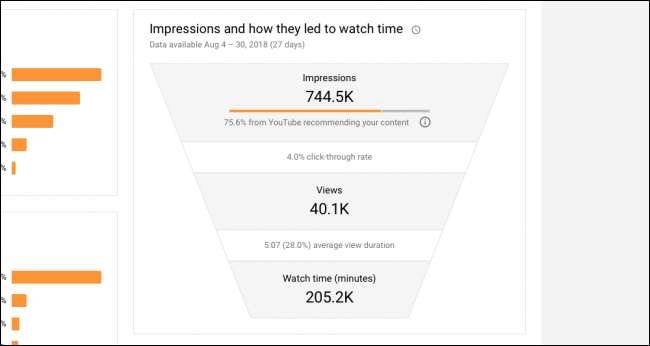 YouTube suggerisce il tuo video a un gruppo di persone, nella schermata iniziale e nella scheda suggerita. Sul mio conto ho quasi 750mila impressioni. Sembra abbastanza buono, ma solo una frazione di queste persone fa clic sul tuo video. Questa frazione è chiamata percentuale di clic ed è misurata come percentuale (puoi vedere nel mio esempio che ho una percentuale di clic del 4,0%). La figura Visualizzazioni mostra il numero effettivo di persone che hanno fatto clic.
