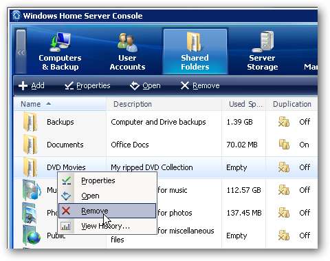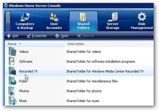 Dopo aver installato Windows Home Server, noterai che le cartelle condivise predefinite sono Musica, Foto, Pubblico, TV registrata, Software e Video. Queste cartelle non possono essere eliminate, ma possiamo creare le nostre cartelle se necessario. Possiamo anche esaminare e modificare le autorizzazioni e visualizzare la cronologia delle cartelle.