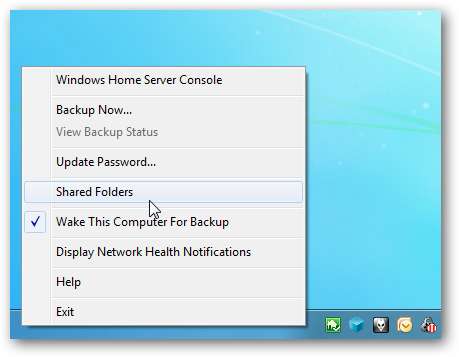 Oppure fare clic con il pulsante destro del mouse sull'icona della console WHS nella barra delle applicazioni e selezionare Cartelle condivise .