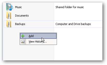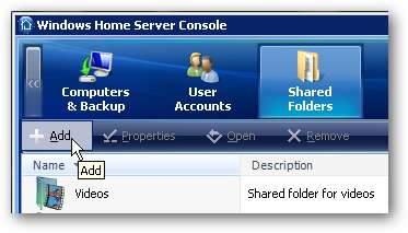 L'aggiunta di una nuova cartella è piuttosto semplice. Aprire la console di Windows Home Server e in Cartelle condivise fare clic su Inserisci dalla barra degli strumenti o fare clic con il pulsante destro del mouse su un'area vuota in Cartelle condivise e selezionare Aggiungi dal menu contestuale.