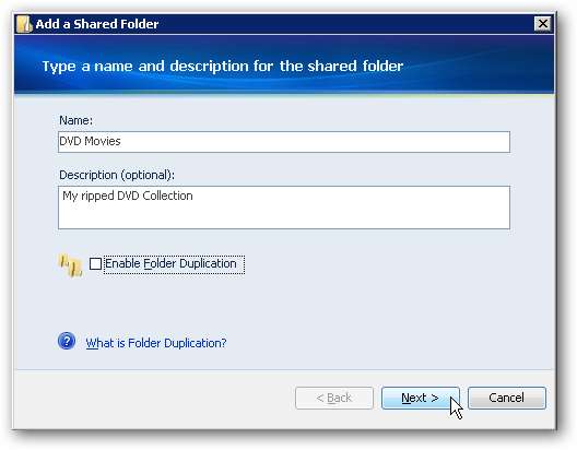 In entrambi i casi verrà visualizzata la procedura guidata Aggiungi una cartella condivisa in cui si digita il nome della cartella e si fornisce una descrizione se lo si desidera. Dovrai decidere se abilitare o meno la duplicazione delle cartelle. Quando è abilitato, duplica la cartella ei file in essa contenuti su più unità sul server. Ci vorrà il doppio dello spazio sulla memoria totale del server e il completamento del processo può richiedere del tempo. In questo esempio ... questi file saranno file video di grandi dimensioni e non è necessario creare un duplicato.