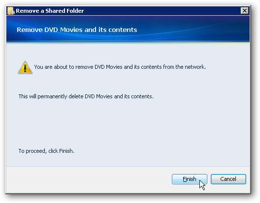 Quindi fai clic su Fine sul messaggio di avviso se sei sicuro di volerlo eliminare. Ricorda che se una cartella viene duplicata, verrà eliminata anche quella. Inoltre non è possibile eliminare le cartelle incluse per impostazione predefinita da WHS.