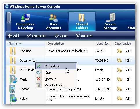 Aprire WHS Console e in Cartelle condivise fare clic con il pulsante destro del mouse e aprire la cartella desiderata.