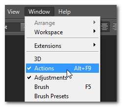 La prima cosa che dobbiamo fare è registrare il processo di creazione dall'inizio alla fine. Per iniziare, apriamo il pannello Azioni in Photoshop. Puoi farlo accedendo a Finestra -> Azioni o premendo ALT + F9: