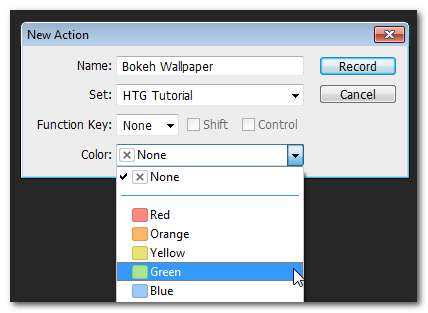 Oltre a nominare la tua nuova azione, puoi anche assegnarle un tasto di scelta rapida per un accesso rapido e facile o un codice colore in modo che risulti visibile nell'elenco. Dopo aver creato la voce Azione, è ora di iniziare effettivamente a registrare le azioni di modifica che desideri vengano ripetute. Ricorda, per questo tutorial useremo Azioni per creare un processo batch per lo sfondo bokeh personalizzato. Puoi seguire il processo generale con tutte le azioni che desideri ripetere.