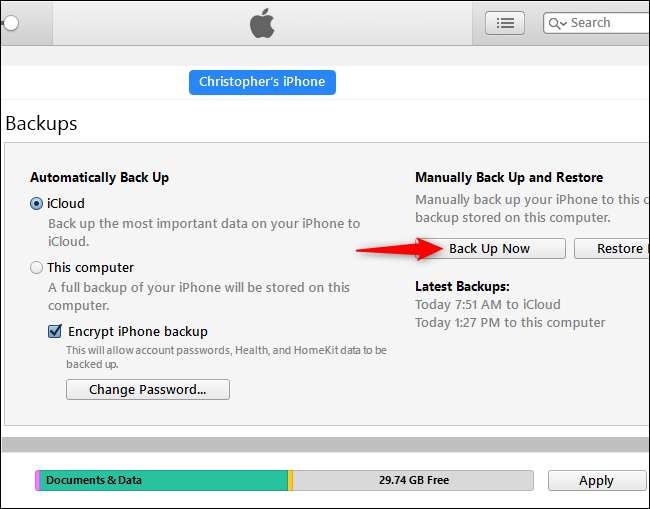 Per creare nuovi backup di iTunes in futuro, fai clic sul pulsante "Esegui backup adesso" mentre il tuo iPhone è collegato al computer tramite il cavo.