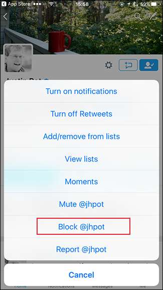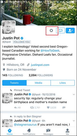 In alternativa, dal profilo dell'utente che si desidera bloccare, toccare l'icona dell'ingranaggio o l'icona delle impostazioni accanto al pulsante Segui. Quindi, tocca Blocca @nomeutente.