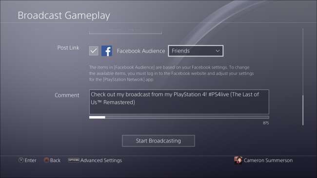 Un po 'più in basso nello schermo, c'è anche un'opzione per condividere il tuo streaming su Facebook. Se hai già collegato il tuo account PlayStation con il tuo account Facebook, questa è una semplice scatola. Altrimenti, accederai e collegherai i due. Ciò significa più battitura del controller. Sìì!