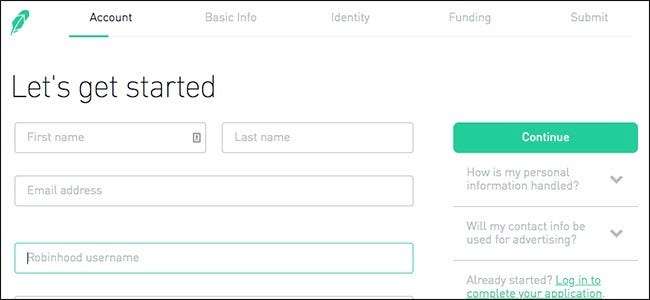 Puoi inviare una domanda per Robinhood sul tuo computer attraverso il loro sito web . È un processo di registrazione piuttosto semplice. Tuttavia, sii pronto a fornire alcune informazioni personali su di te, inclusi indirizzo, data di nascita, numero di previdenza sociale e una copia della patente di guida. Questa roba è necessaria per dimostrare la tua identità e Robinhood tirerà anche il tuo rapporto di credito. Ciò significa che potresti dover attendere alcuni giorni per ottenere l'approvazione, anche se potrebbe essere necessaria anche un'ora.