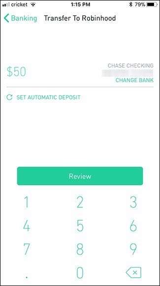Dopo aver collegato il tuo conto bancario, puoi trasferire denaro a Robinhood. Immettere l'importo che si desidera trasferire, quindi premere il pulsante "Rivedi". Se sembra buono, tocca "Invia" per finalizzare la transazione. I trasferimenti inferiori a $ 1.000 vengono effettuati immediatamente, mentre importi maggiori richiedono 4-5 giorni lavorativi.