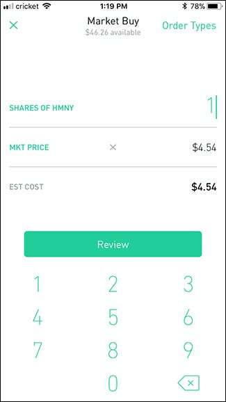 Digita il numero di azioni che desideri acquistare, quindi tocca il pulsante "Rivedi".