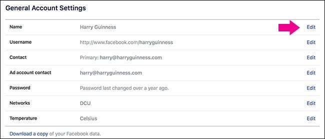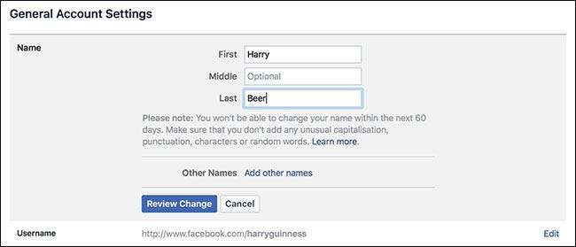 Prima di approfondire, vale la pena dare un'occhiata alla politica sui nomi di Facebook. Devi usare " il nome [you] passa nella vita di tutti i giorni ", Ma questo ti offre una discreta flessibilità. Il mio nome su Facebook è Harry ed è come mi chiamano tutti, ma non è il nome sul mio certificato di nascita.