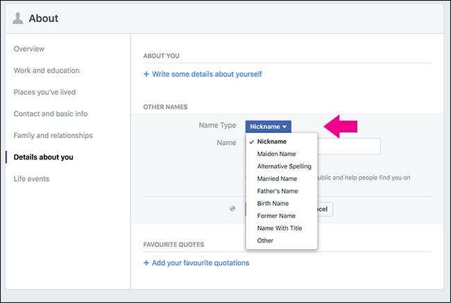 Se hai un soprannome, un nome professionale o un altro nome che non usi necessariamente nella vita di tutti i giorni ma che desideri allegare al tuo profilo Facebook, fai clic su Aggiungi altri nomi. Questi altri nomi aiuteranno le persone a trovarti nella ricerca, quindi, ad esempio, verrai visualizzato per le ricerche sia del tuo nome da sposato che da quello da nubile.