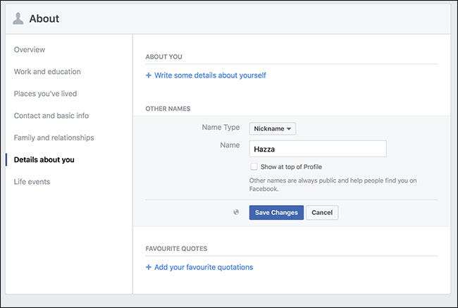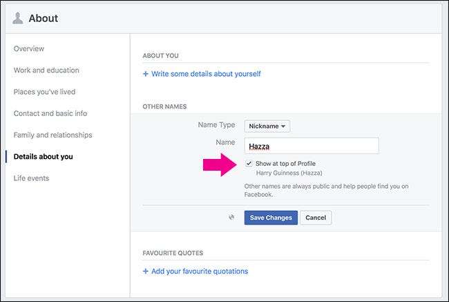 Se selezioni la casella Mostra in cima al profilo, il nome che scegli verrà mostrato tra parentesi dopo il nome del tuo profilo Facebook. Ad esempio, con questo soprannome, il mio profilo Facebook direbbe Harry Guinness (Hazza).