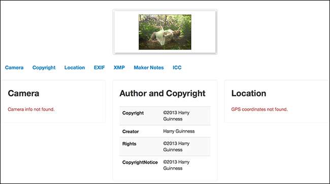 Vedrai tutti i metadati incorporati nell'immagine. Se è presente, i dati sul copyright saranno in primo piano. Puoi vedere che, sorprendentemente, sono il titolare del copyright dell'immagine che sto usando come esempio.