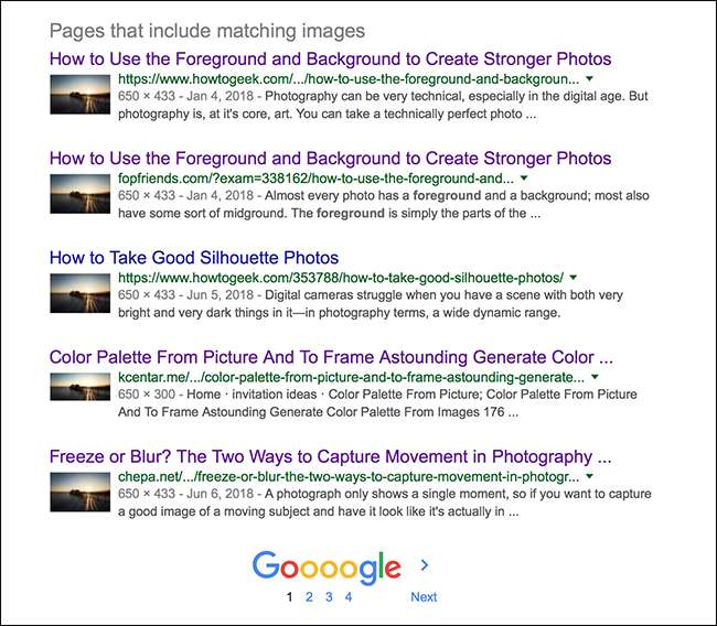 Google ti mostrerà ciò che pensa sia l'immagine e alcune foto visivamente simili, ma ciò che ci interessa è la sezione "Pagine che includono immagini corrispondenti".