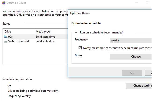 Su Windows 8 e 10, Windows ottimizza automaticamente le unità a stato solido in base a una pianificazione eseguendo l'operazione "retrim". Ciò è necessario perché, se molte richieste TRIM vengono inviate a un'unità contemporaneamente, le richieste possono accumularsi in una coda e quindi essere scartate. Windows esegue regolarmente ottimizzazioni "retrim" che assicurano che tutte le richieste TRIM inviate a un'unità vengano effettivamente elaborate. Puoi leggi di più su questo sul blog del dipendente Microsoft Scott Hanselman.