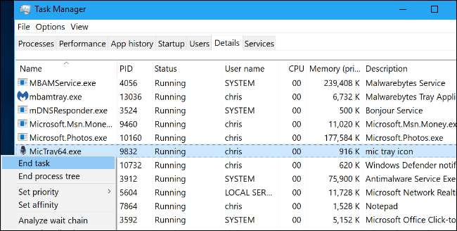 Innanzitutto, apri Task Manager facendo clic con il pulsante destro del mouse sulla barra delle applicazioni e selezionando "Task Manager". Fare clic su "Ulteriori dettagli", fare clic sulla scheda "Dettagli", individuare MicTray64.exe o MicTray.exe nell'elenco, fare clic con il pulsante destro del mouse e selezionare "Termina operazione".