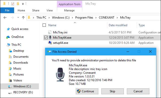 Se la correzione non è stata ancora rilasciata o non è possibile eseguire Windows Update per qualche motivo, è possibile rimuovere il software che causa il problema. Sarà necessario eliminare il file MicTray.exe o MicTray64.exe. Ciò impedirà il funzionamento di alcuni tasti funzione multimediali sulla tastiera, ma è un piccolo prezzo temporaneo da pagare per la sicurezza.