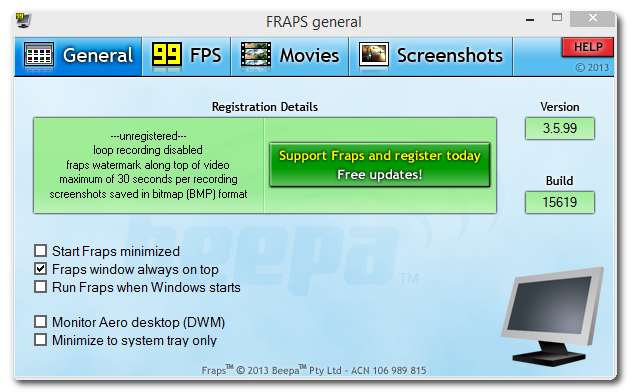 Fortunatamente per te, c'è un fantastico e gratuito strumento che fornisce, alla lettera, quello che stai cercando: FRAPS . FRAPS è un'applicazione Windows facile da usare che si inserisce efficacemente tra il gioco e l'hardware in modo da poter monitorare cosa sta succedendo mentre stai giocando. La versione gratuita offre monitor FPS su schermo, dati di benchmark salvati, screenshot (solo in formato BMP) e registrazione dello schermo (limitato a 30 secondi con filigrana). La versione a pagamento ($ 37), sblocca più formati nello strumento screenshot e rimuove le limitazioni sullo strumento di registrazione dello schermo. Se inizi a registrare le tue sessioni di gioco, vale la pena la versione a pagamento, ma per lo scopo che descrivi (monitoraggio delle prestazioni) la versione gratuita va benissimo. Andiamo Scarica , installalo e fai un tour.