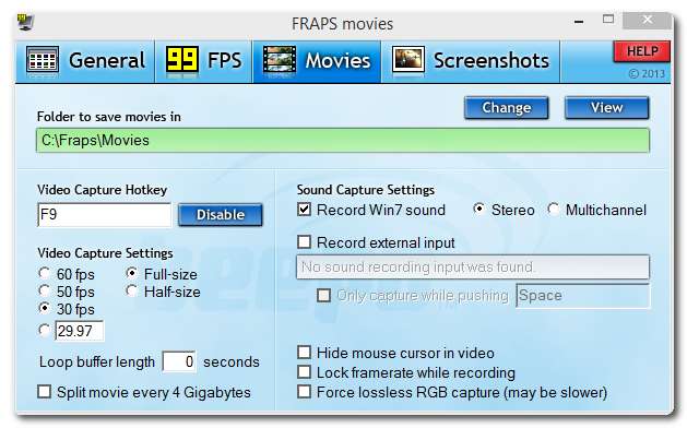 Anche se potresti non utilizzare FRAPS per la registrazione di video, ecco tutte le impostazioni che troverai nella scheda Film. Se hai un'improvvisa voglia di iniziare a registrare le tue riproduzioni di gioco per un pubblico di YouTube, troverai questa sezione particolarmente interessante.