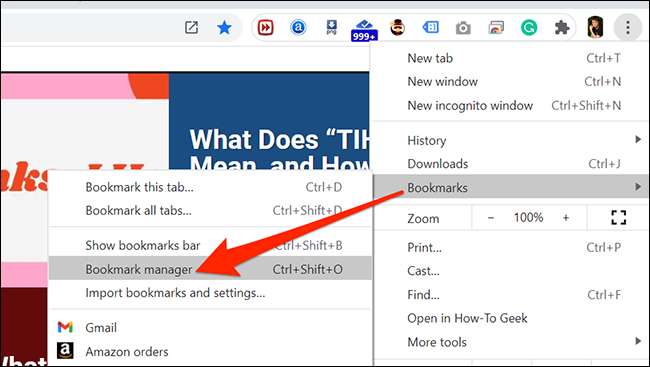 Avanti, Apri il Gestione Bookmark Chrome facendo clic sul menu Chrome (Tre punti) nell'angolo in alto a destra della finestra del browser e selezionando Segnalibri e GT; Gestione dei segnalibri.