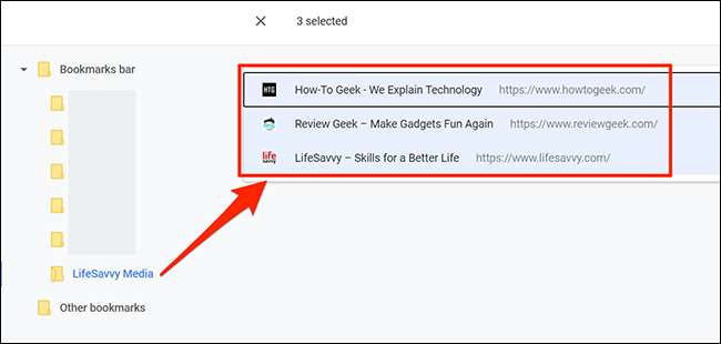 Nella finestra Gestione Bookmark, selezionare la cartella Segnalibro appena creata nella barra laterale a sinistra. Successivamente, fai clic sul primo segnalibro nell'elenco a destra e premi Ctrl + A (Windows e Linux) o Comando + A (Mac) per selezionare ogni segnalibro nell'elenco.