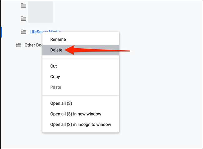 Sulla barra laterale sinistra della finestra Gestione Bookmark, fare clic con il pulsante destro del mouse sulla cartella dei segnalibri che hai precedentemente creato e seleziona "Elimina" dal menu.