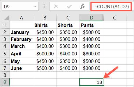 Per contare il numero di celle nell'intervallo A1 tramite D7 che contiene numeri, digitare il seguente e premere Invio: