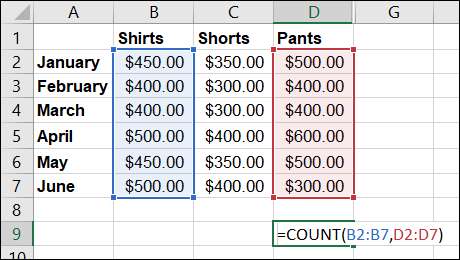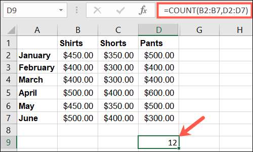 Per contare il numero di celle in due intervalli separati B2 tramite B7 e D2 tramite D7 che contengono numeri, si digitare il seguente e premere Invio: