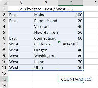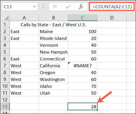 Come puoi vedere, la funzione Counta conta celle contenenti qualsiasi tipo di dati. Ciò include numeri, testo, errori e testo vuoto o stringhe. Ad esempio, viene contato l'errore nella cella C7.
