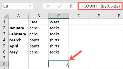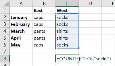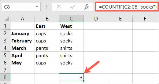 Per contare il numero di celle nell'intervallo C2 attraverso C6 che contengono la parola "calze", si digitarebbe il seguente e premere Invio: