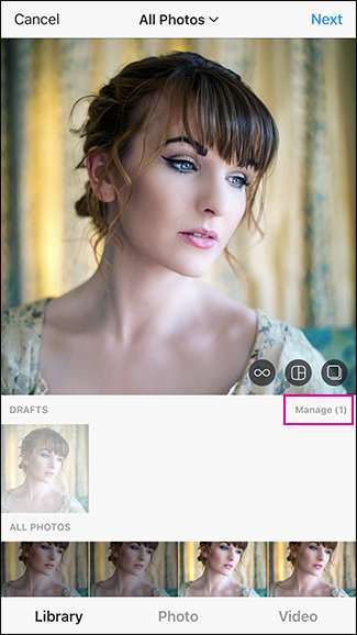 Apri Instagram e vai a pubblicare una foto. Sopra tutte le foto sul tuo telefono, vedrai una sezione Bozze. Se vuoi pubblicare quella foto, selezionala; altrimenti, se vuoi eliminarlo dalle tue bozze, tocca Gestisci.