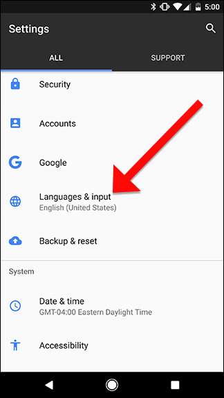 Questo processo dovrebbe funzionare se hai uno smartphone Android in esecuzione Android Marshmallow o versioni successive . Per i telefoni più vecchi, puoi anche modificare questa impostazione dall'app Impostazioni. Apri l'app Impostazioni sul telefono e scorri verso il basso fino a "Lingue e immissione".