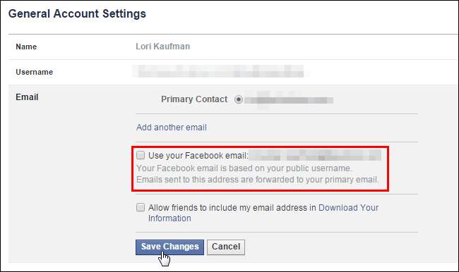 La sezione "Email" si espande. Per disabilitare la tua e-mail di Facebook, seleziona la casella di controllo "Usa la tua e-mail di Facebook" in modo che non ci siano segni di spunta nella casella. Fai clic su "Salva modifiche".