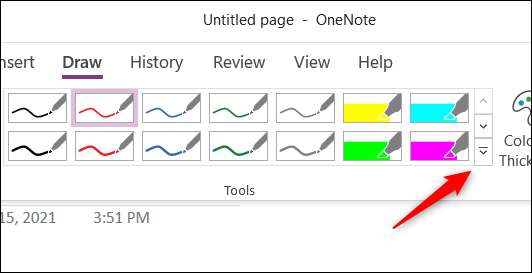 Per avviare il disegno, è possibile selezionare una penna o uno stile evidenziatore dalla griglia della libreria facendo clic su quello che si desidera utilizzare. Ci sono più opzioni disponibili rispetto a ciò che vedi nel menu. Per espandere il menu, fare clic sul pulsante "Altro", che è una freccia rivolta verso il basso con una linea orizzontale sopra di esso.