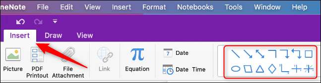 La creazione di forme in OneNote per Mac è la stessa di Windows 10, tranne che le forme sono in una scheda diversa. Per trovare le tue forme in OneNote per Mac, fai clic sulla scheda "Inserisci". Qui troverai una piccola biblioteca di forme da scegliere nella barra degli strumenti.
