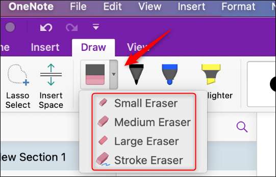 In alternativa, è possibile utilizzare lo strumento "GRASSER" nel gruppo "Strumenti". Fare clic sulla freccia giù nell'opzione "Eraser" per mostrare il menu con diverse dimensioni di gomma. "Eraser di corsa" cancellerà un colpo selezionato alla volta.