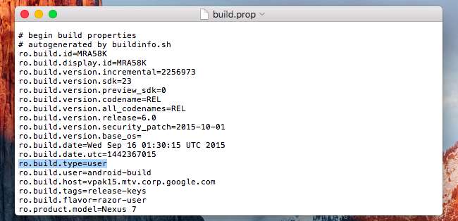Questo scarica una copia del file /system/build.prop dal tuo dispositivo Android al tuo computer. Apri il file build.prop con un editor di testo - Notepad ++ è buono se utilizzi Windows e individua la riga "ro.build.type".