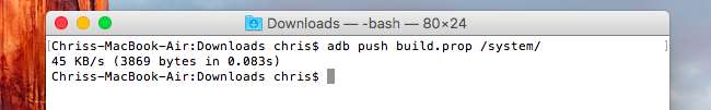 Torna alla riga di comando o alla finestra del terminale ed esegui il comando seguente per copiare il file build.prop modificato sul tuo dispositivo Android: